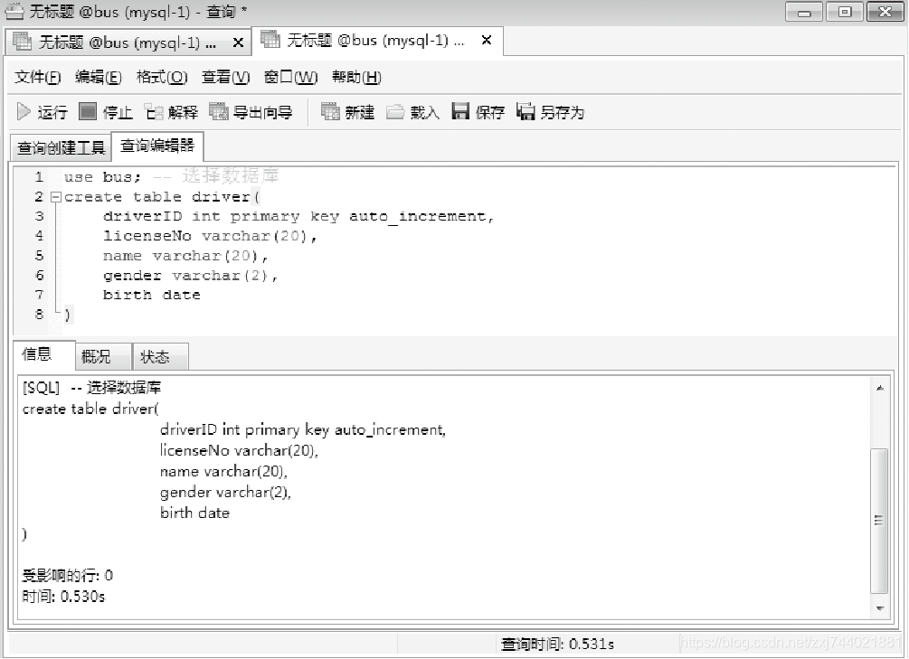 语法:use bus; -- 选择数据库 create table driver( driverID int primary key auto_increment, licenseNo varchar(20), name varchar(20), gender varchar(2), birth date )