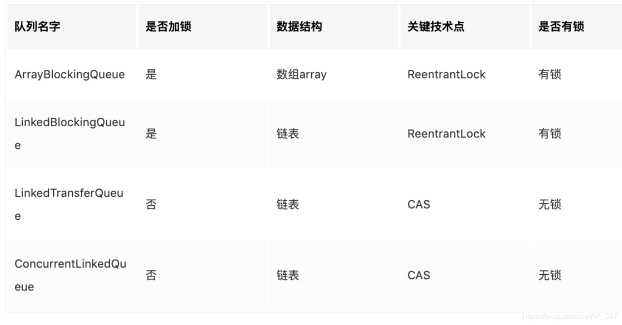 我们可以看见,我们无锁的队列是无界的,有锁的队列是有界的,这里就会涉及到一个问题,我们在真正的线上环境中,无界的队列,对我们系统的影响比较大,有可能会导致我们内存直接溢出,所以我们首先得排除无界队列,当然并不是无界队列就没用了,只是在某些场景下得排除。其次还剩下ArrayBlockingQueue,LinkedBlockingQueue两个队列,他们两个都是用ReentrantLock控制的线程安全,他们两个的区别一个是数组,一个是链表。