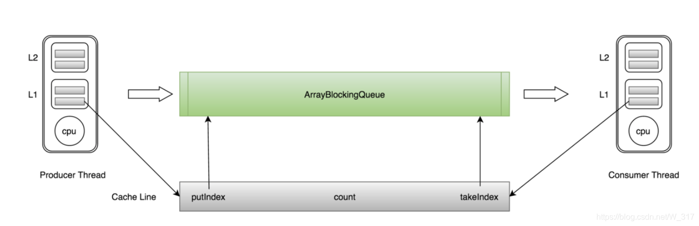 如上图所示, 当生产者线程put一个元素到ArrayBlockingQueue时, putIndex会修改, 从而导致消费者线程的缓存中的缓存行无效, 需要从主存中重新读取.