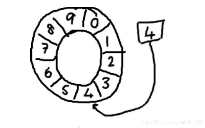 基本来说,ringbuffer拥有一个序号,这个序号指向数组中下一个可用的元素。(如下图右边的图片表示序号,这个序号指向数组的索引4的位置