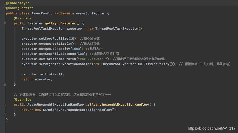 public class AsyncConfig implements AsyncConfigurer {@Overridepublic Executor getAsyncExecutor() {ThreadPoolTaskExecutor executor = new ThreadPoolTaskExecutor();executor.setCorePoolSize(10); //核心线程数executor.setMaxPoolSize(20); //最大线程数executor.setQueueCapacity(1000); //队列大小executor.setKeepAliveSeconds(300); //线程最大空闲时间executor.setThreadNamePrefix("fsx-Executor-"); //指定用于新创建的线程名称的前缀。executor.setRejectedExecutionHandler(new ThreadPoolExecutor.CallerRunsPolicy()); // 拒绝策略(一共四种,此处省略)executor.initialize();return executor;}// 异常处理器:当然你也可以自定义的,这里我就这么简单写了~~~@Overridepublic AsyncUncaughtExceptionHandler getAsyncUncaughtExceptionHandler() {return new SimpleAsyncUncaughtExceptionHandler();}