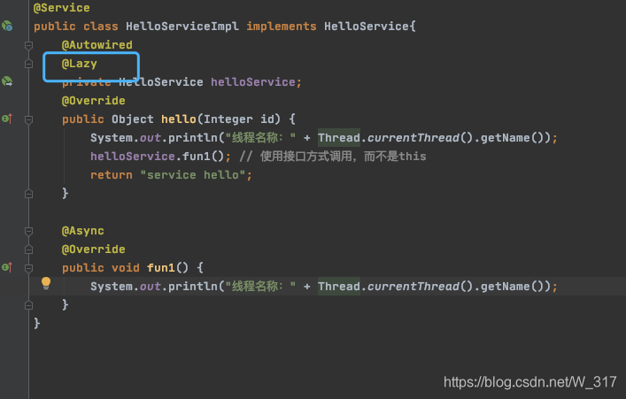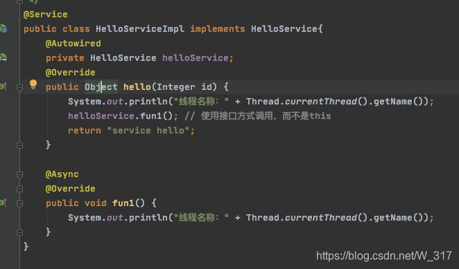 public class HelloServiceImpl implements HelloService{@Autowiredprivate HelloService helloService;@Overridepublic Object hello(Integer id) {System.out.println("线程名称:" + Thread.currentThread().getName());helloService.fun1(); // 使用接口方式调用,而不是thisreturn "service hello";}@Async@Overridepublic void fun1() {System.out.println("线程名称:" + Thread.currentThread().getName());}