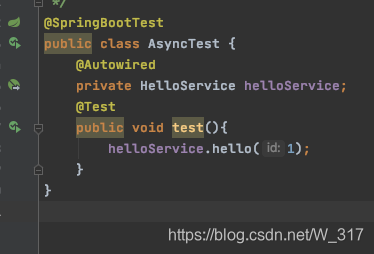 public class AsyncTest {@Autowiredprivate HelloService helloService;@Testpublic void test(){helloService.hello(1);}