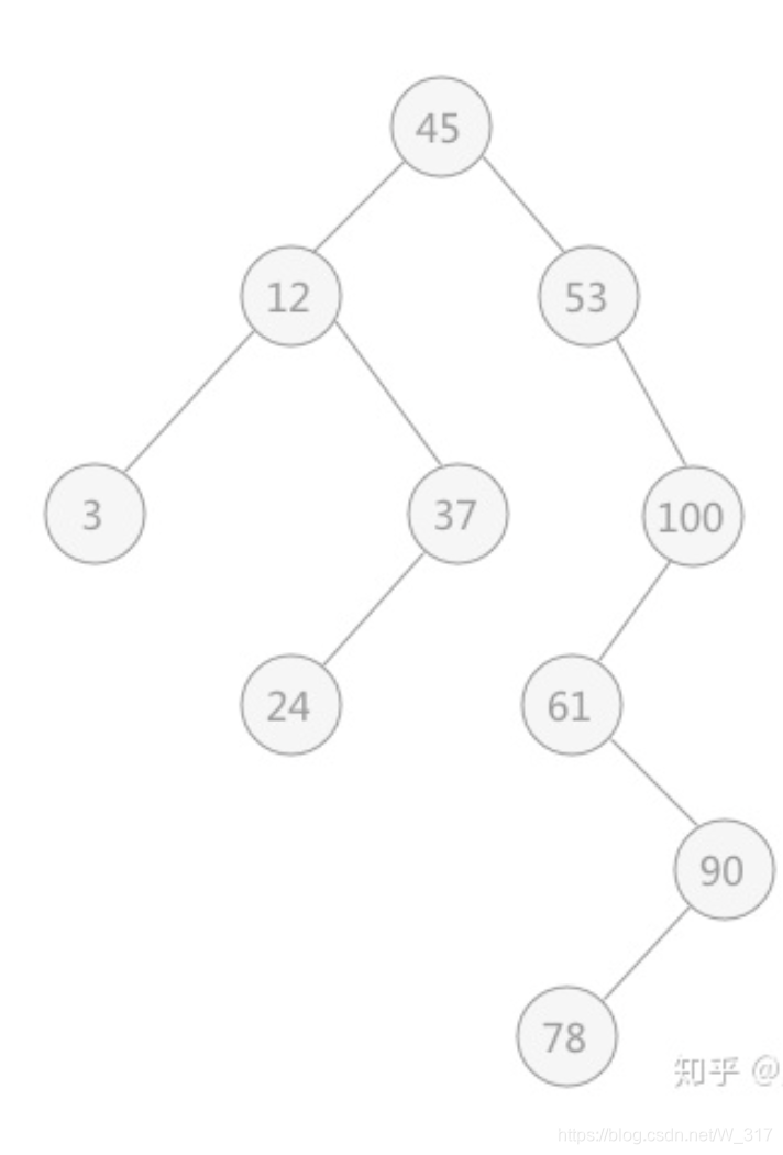 每个节点左边节点的值都小于该节点,右边节点的值都大于该节点,没有值相等的节点,最顶端的节点也就是“45”被称为根节点。
