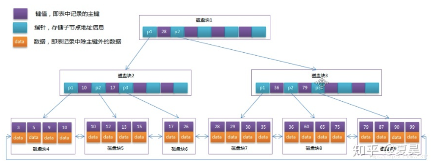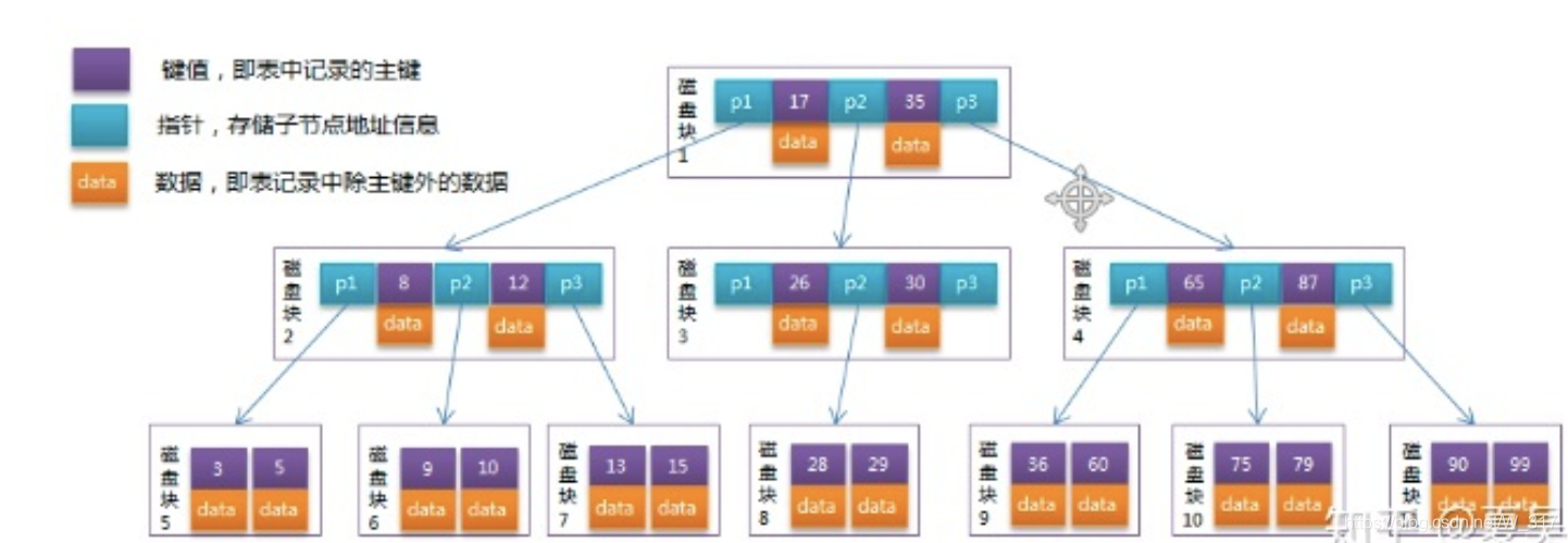 每点占用一个磁盘块的磁盘空个节间,一个节点上有两个升序排序的键值和三个指向子树根节点的指针,指针存储的是子节点所在磁盘块的地址。两个键值划分成的三个范围域对应三个指针指向的子树的数据的范围域。以根节点为例,键值为17和35,P1指针指向的子树的数据范围为小于17,P2指针指向的子树的数据范围为17~35,P3指针指向的子树的数据范围为大于35。