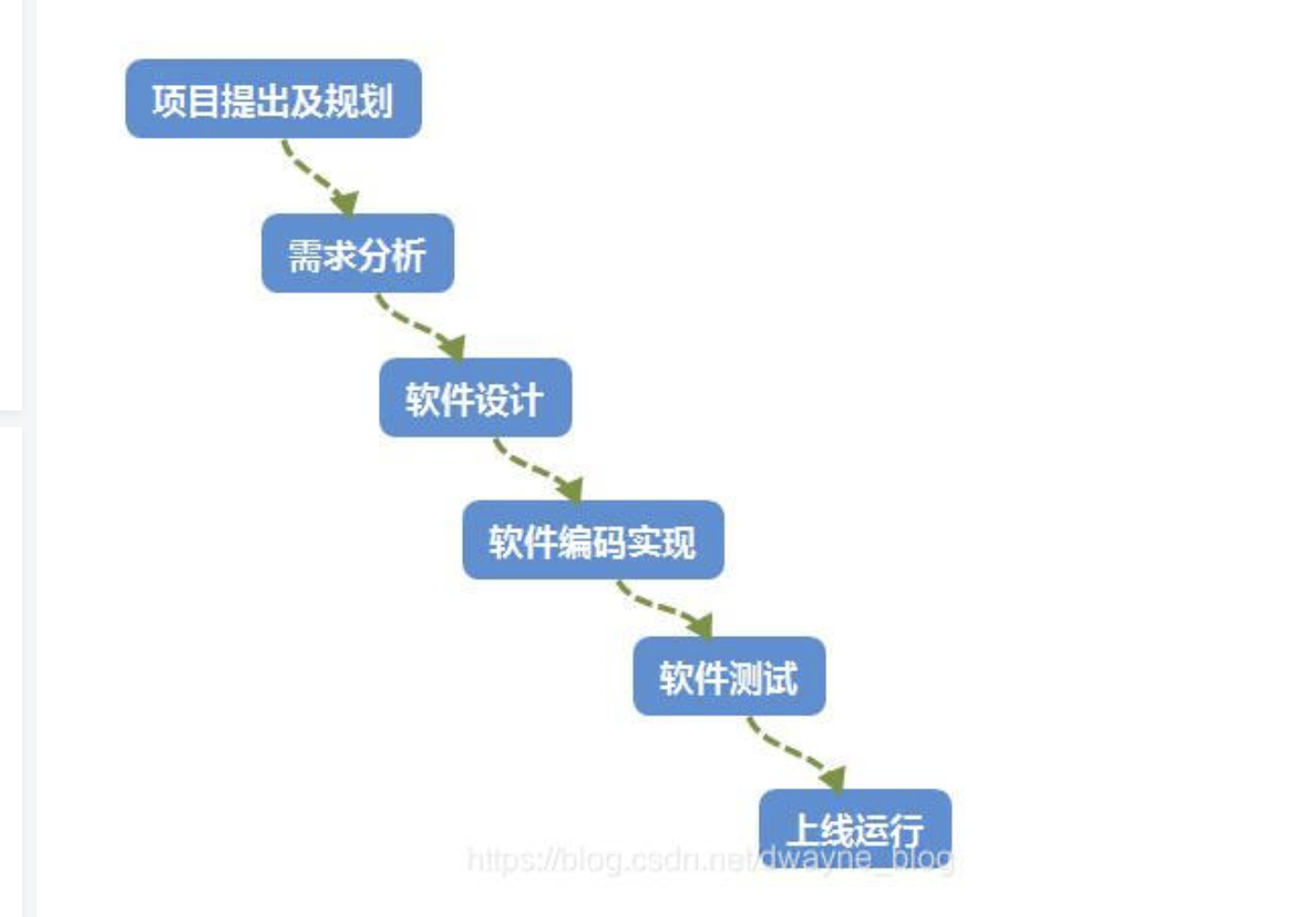 从图中可以看出,瀑布模型分为:项目提出及规划—需求分析—软件设计—软件编码实现—软件测试—上线运行等6个阶段。这几个阶段相互递进,也就是说本阶段完成后才能进行下一阶段的工作。