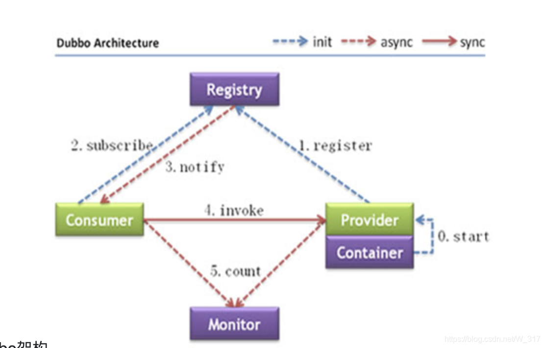 Provider: 暴露服务的服务提供方。 Consumer: 调用远程服务的服务消费方。 Registry: 服务注册与发现的注册中心。 Monitor: 统计服务的调用次数和调用时间的监控中心。