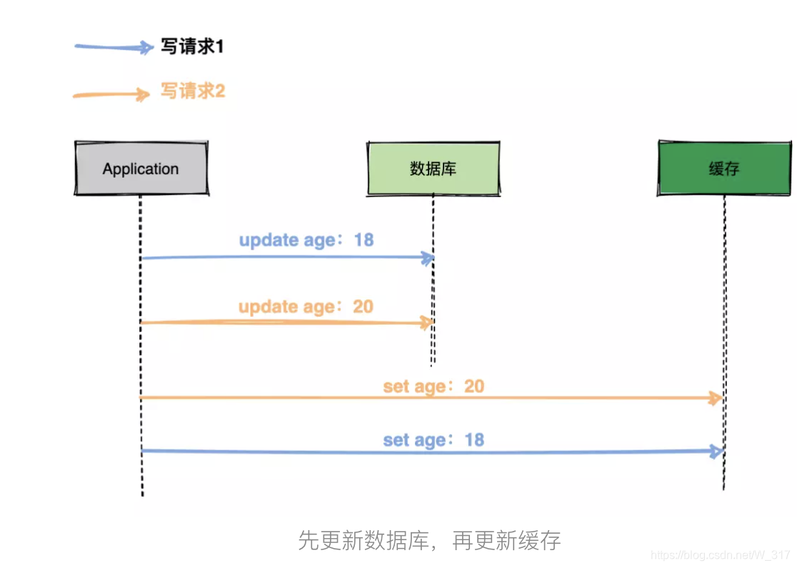 如果同时有两个写请求需要更新数据,每个写请求都先更新数据库再更新缓存,在并发场景可能会出现数据不一致的情况