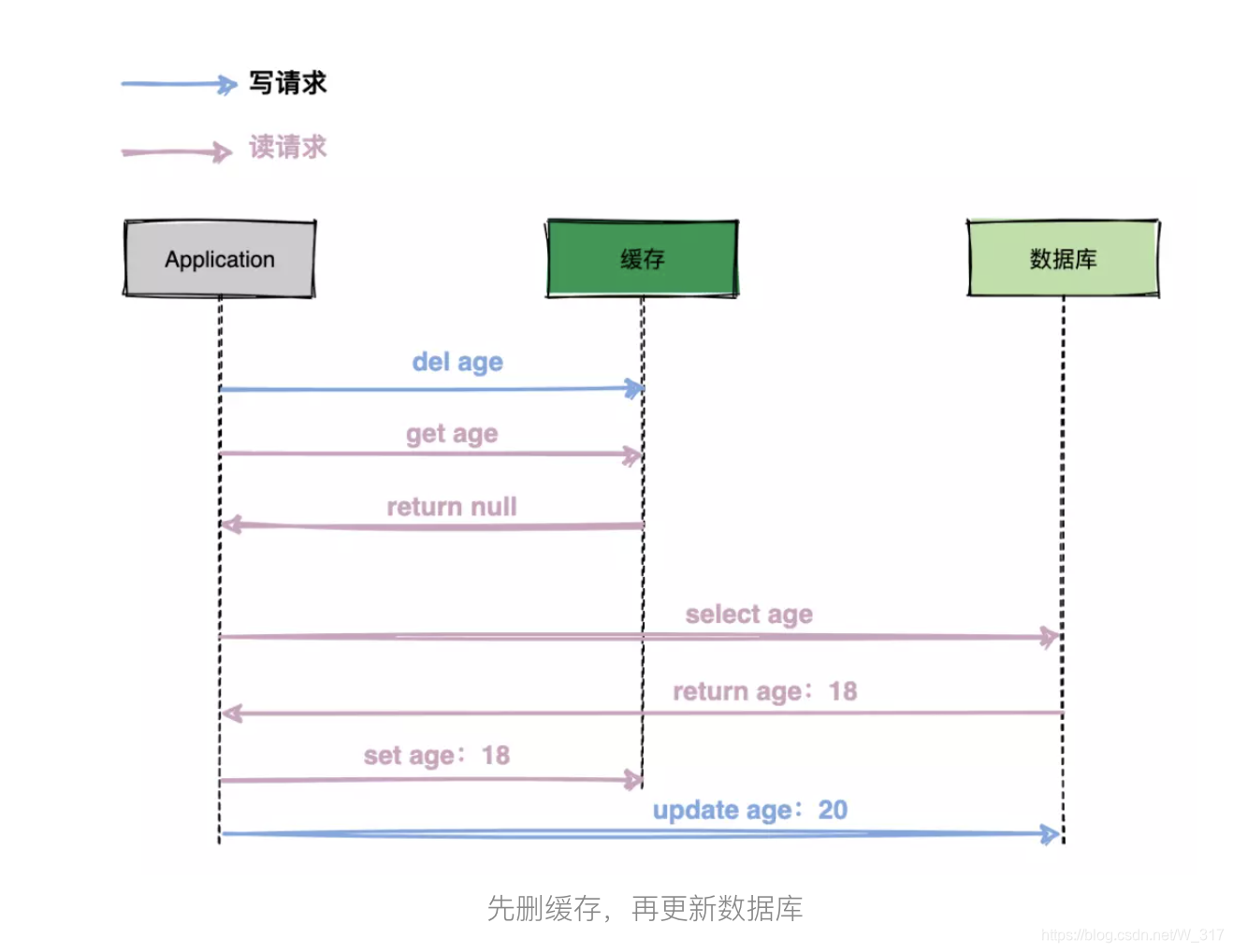 看了写请求的图之后,有些同学可能要问了:为什么要删除缓存,直接更新不就行了?这里涉及到几个坑,我们一步一步踩下去。
