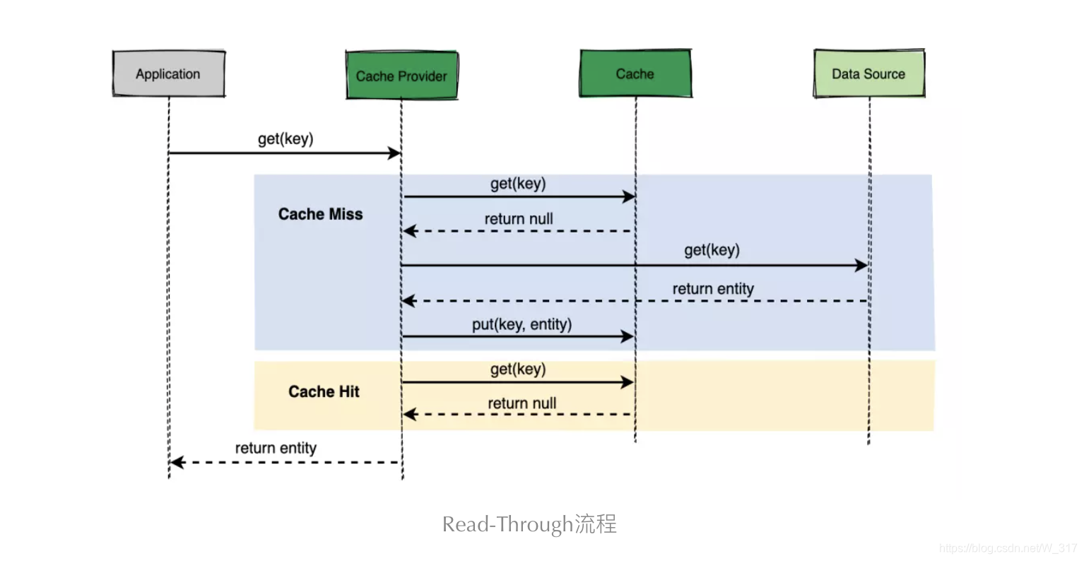 在 Read-Through 中,此逻辑通常是由独立的缓存提供程序(Cache Provider)支持。