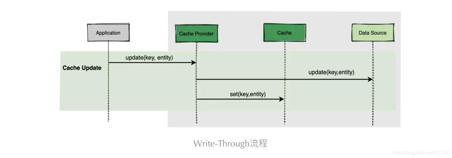Write-Through 策略下,当发生数据更新(Write)时,缓存提供程序 Cache Provider 负责更新底层数据源和缓存。