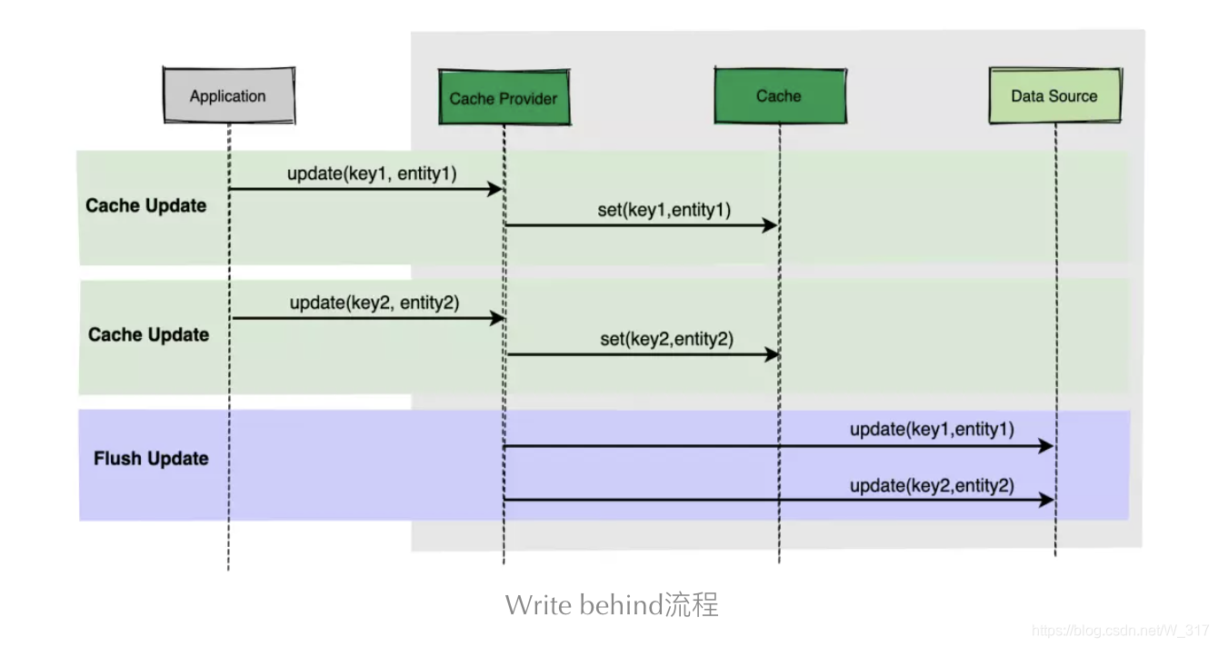 Write behind在一些地方也被称为Write back, 简单理解就是:应用程序更新数据时只更新缓存, Cache Provider每隔一段时间将数据刷新到数据库中。说白了就是延迟写入。