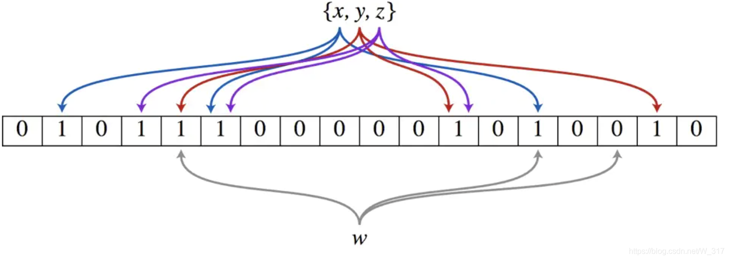 以上图为例,具体的操作流程:假设集合里面有3个元素{x, y, z},哈希函数的个数为3。首先将位数组进行初始化,将里面每个位都设置位0。对于集合里面的每一个元素,将元素依次通过3个哈希函数进行映射,每次映射都会产生一个哈希值,这个值对应位数组上面的一个点,然后将位数组对应的位置标记为1。查询W元素是否存在集合中的时候,同样的方法将W通过哈希映射到位数组上的3个点。如果3个点的其中有一个点不为1,则可以判断该元素一定不存在集合中。反之,如果3个点都为1,则该元素可能存在集合中。注意:此处不能判断该元素是否一定存在集合中,可能存在一定的误判率。可以从图中可以看到:假设某个元素通过映射对应下标为4,5,6这3个点。虽然这3个点都为1,但是很明显这3个点是不同元素经过哈希得到的位置,因此这种情况说明元素虽然不在集合中,也可能对应的都是1,这是误判率存在的原因。