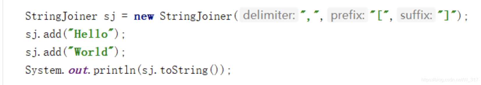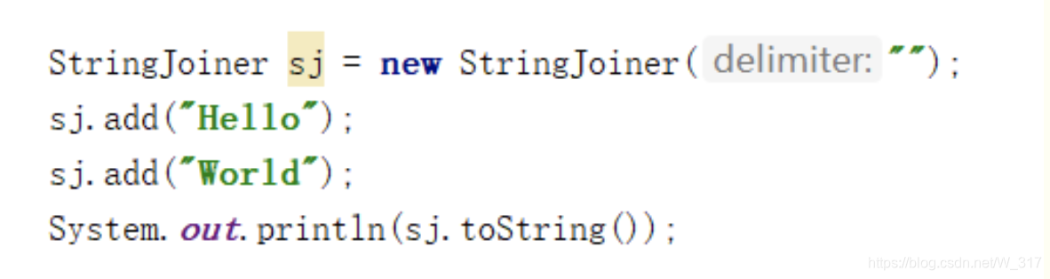 注:当我们使用StringJoiner(CharSequence delimiter)初始化一个StringJoiner的时候,这个delimiter其实是分隔符,并不是字符串的初始值