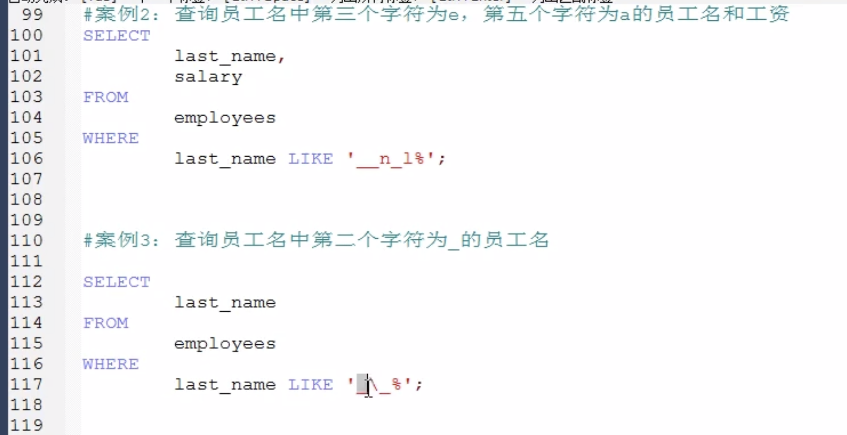 案例2中,查询员工名中第二个字符为_的员工名,需要转义一下