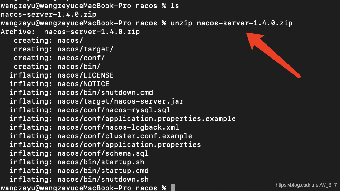 5:对文件进行解压,在终端执行 unzip nacos-server-1.4.0.zip