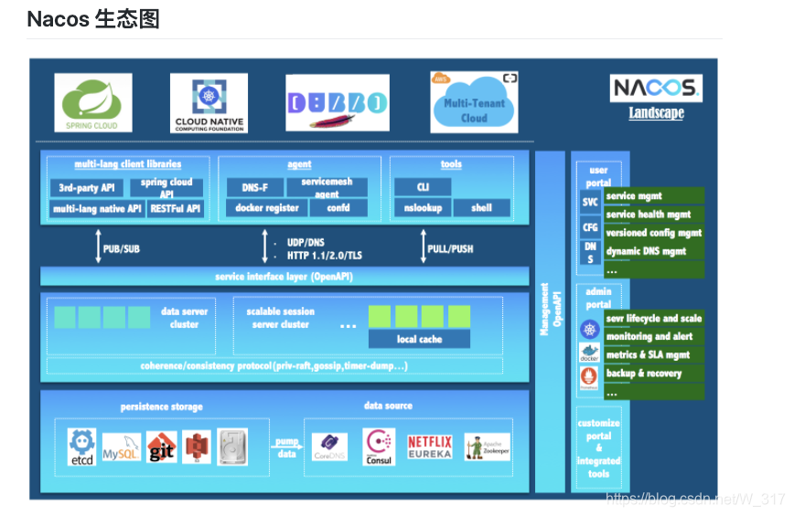 -  服务及其元数据管理 Nacos 能让您从微服务平台建设的视角管理数据中心的所有服务及元数据,包括管理服务的描述、生命周期、服务的静态依赖分析、服务的健康状态、服务的流量管理、路由及安全策略、服务的 SLA 以及最首要的 metrics 统计数