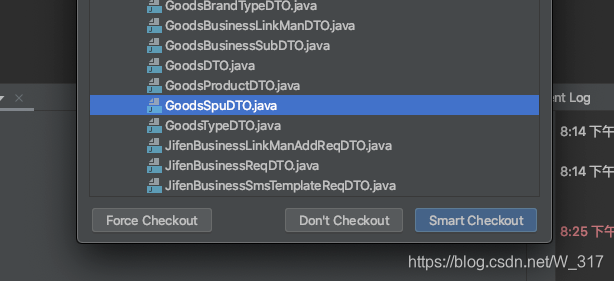 smart checkout就会把冲突的这部分内容带到目的分支(如果你没有点进窗口的那些文件处理冲突的话)
