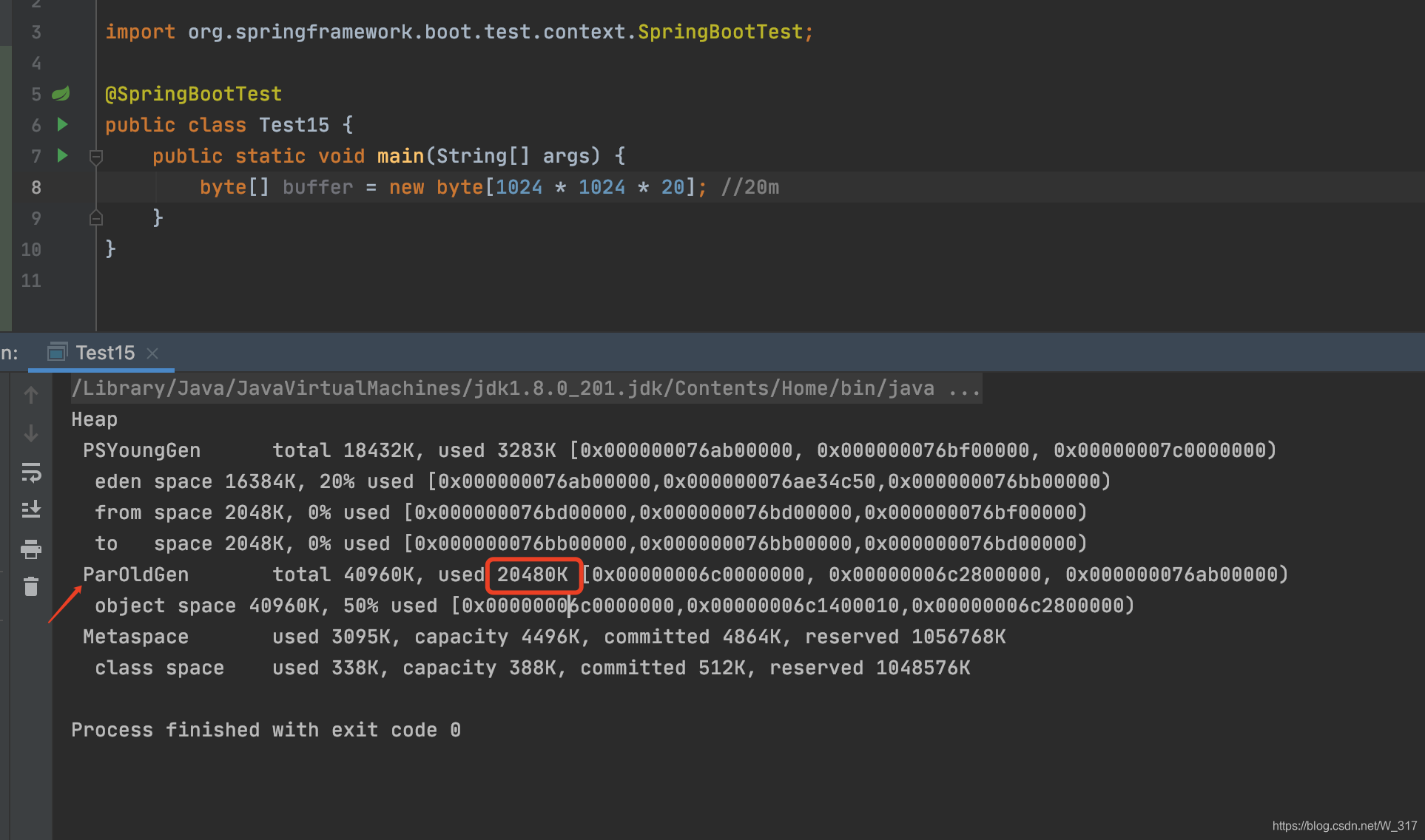 运行后看下如下,可以看到ParOldGen老年代,为used 20480K,也就20M,说明大对象直接分配到老年代