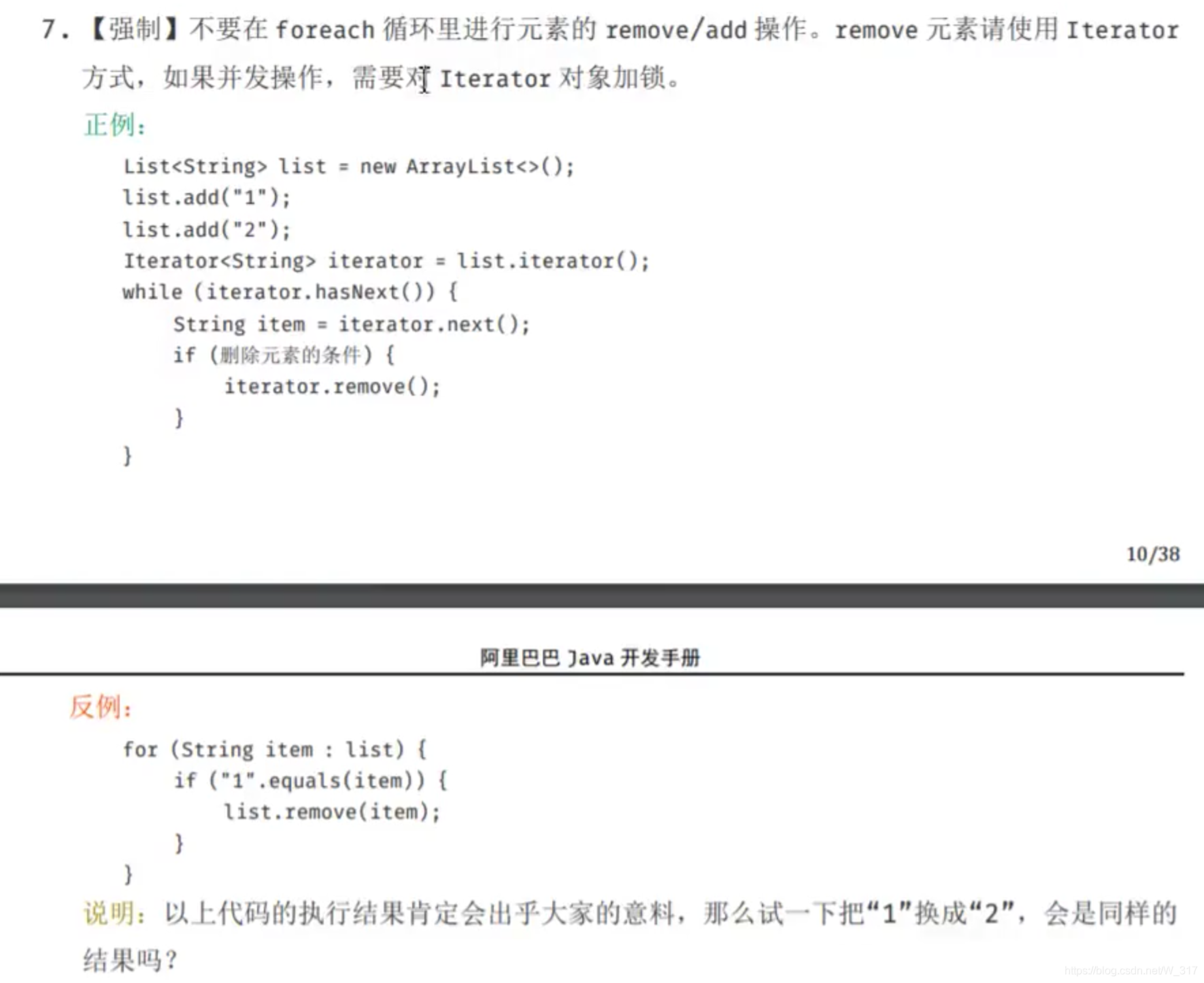 不要在foreach循环里进行元素的remove/add操作。remove元素请使用iteratot方式,如果并发操作,需要对Iterator对象加锁
