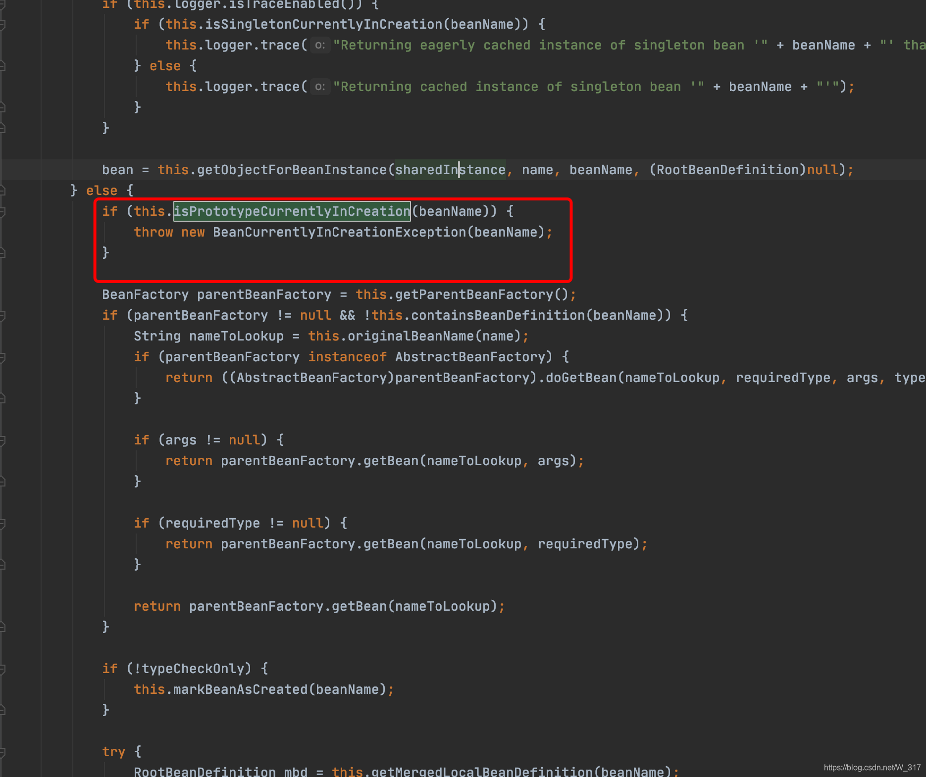 原型(Prototype)的场景是不支持循环依赖的,通常会走到AbstractBeanFactory类中下面的判断,抛出异常。