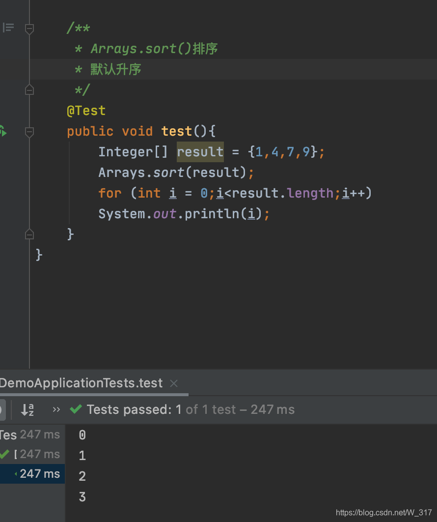 /*** Arrays.sort()排序* 默认升序*/@Testpublic void test(){Integer[] result = {1,4,7,9};Arrays.sort(result);for (int i = 0;i<result.length;i++)System.out.println(i);}