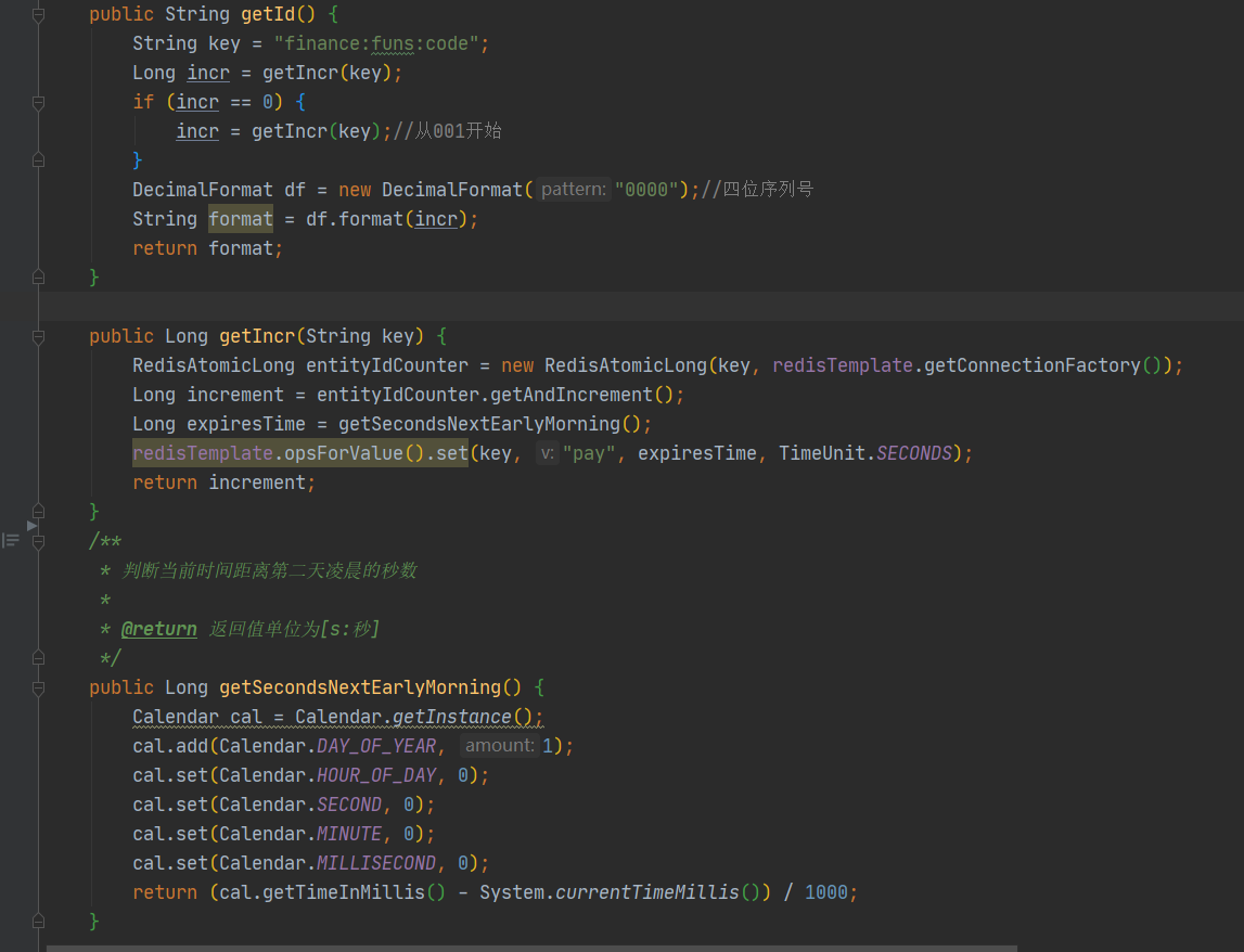 public String getId() {String key = "finance:funs:code";Long incr = getIncr(key);if (incr == 0) {incr = getIncr(key);//从0001开始}DecimalFormat df = new DecimalFormat("0000");//四位序列号String format = df.format(incr);return format;}public Long getIncr(String key) {RedisAtomicLong entityIdCounter = new RedisAtomicLong(key, redisTemplate.getConnectionFactory());Long increment = entityIdCounter.getAndIncrement();Long expiresTime = getSecondsNextEarlyMorning();redisTemplate.opsForValue().set(key, "pay", expiresTime, TimeUnit.SECONDS);return increment;}/*** 判断当前时间距离第二天凌晨的秒数** @return 返回值单位为[s:秒]*/public Long getSecondsNextEarlyMorning() {Calendar cal = Calendar.getInstance();cal.add(Calendar.DAY_OF_YEAR, 1);cal.set(Calendar.HOUR_OF_DAY, 0);cal.set(Calendar.SECOND, 0);cal.set(Calendar.MINUTE, 0);cal.set(Calendar.MILLISECOND, 0);return (cal.getTimeInMillis() - System.currentTimeMillis()) / 1000;}key自己替换