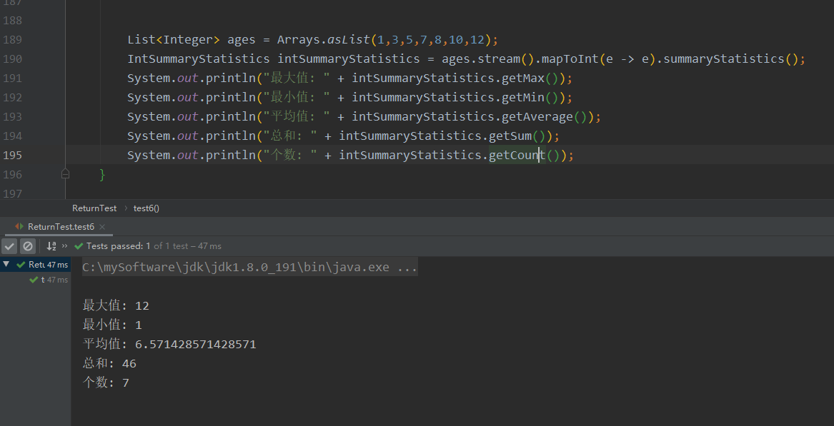 IntSummaryStatistics intSummaryStatistics = ages.stream().mapToInt(e -> e).summaryStatistics();