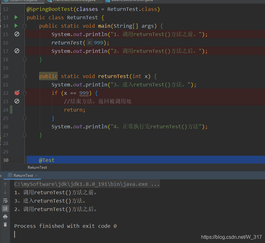 }public static void returnTest(int x) {System.out.println("3、进入returnTest()方法。");if (x == 999) {//结束方法,返回被调用处return;}System.out.println("4、正常执行完returnTest()方法");