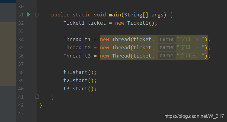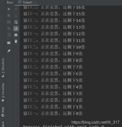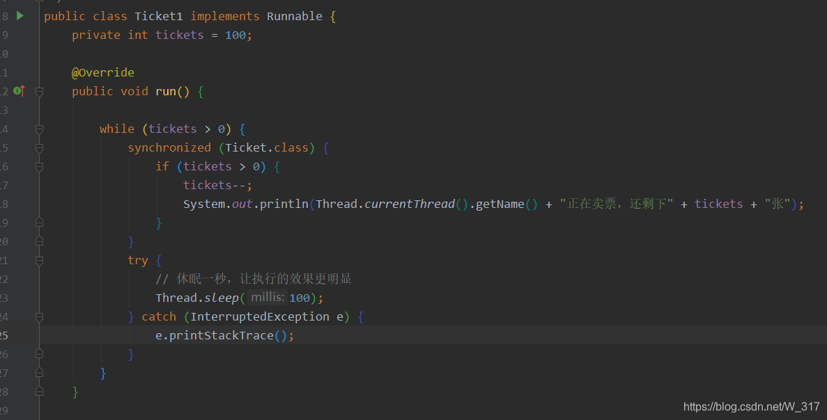 public class Ticket1 implements Runnable {private int tickets = 100;@Overridepublic void run() {while (tickets > 0) {synchronized (Ticket.class) {if (tickets > 0) {tickets--;System.out.println(Thread.currentThread().getName() + "正在卖票,还剩下" + tickets + "张");}}try {// 休眠一秒,让执行的效果更明显Thread.sleep(100);} catch (InterruptedException e) {e.printStackTrace();}}}public static void main(String[] args) {Ticket1 ticket = new Ticket1();Thread t1 = new Thread(ticket, "窗口一:");Thread t2 = new Thread(ticket, "窗口二:");Thread t3 = new Thread(ticket, "窗口三:");t1.start();t2.start();t3.start();}