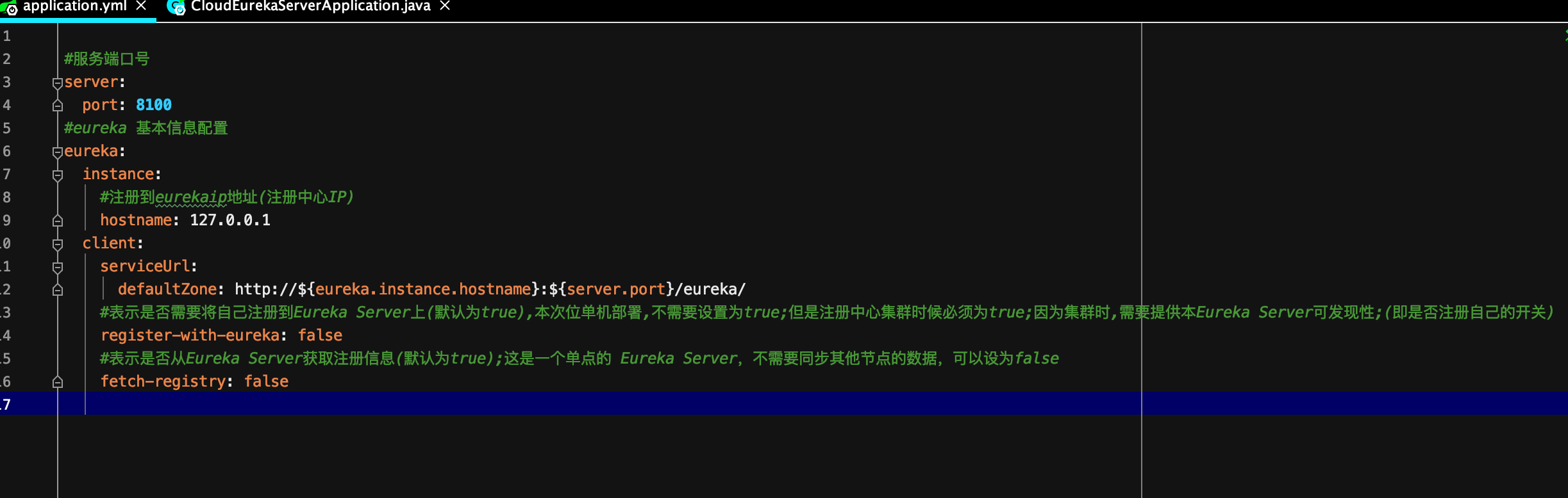 eureka:instance:#注册到eurekaip地址(注册中心IP)hostname: 127.0.0.1client:serviceUrl:defaultZone: http://${eureka.instance.hostname}:${server.port}/eureka/#表示是否需要将自己注册到Eureka Server上(默认为true),本次位单机部署,不需要设置为true;但是注册中心集群时候必须为true;因为集群时,需要提供本Eureka Server可发现性;(即是否注册自己的开关)register-with-eureka: false#表示是否从Eureka Server获取注册信息(默认为true);这是一个单点的 Eureka Server,不需要同步其他节点的数据,可以设为falsefetch-registry: false