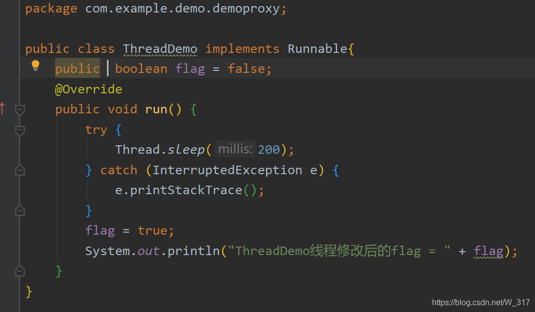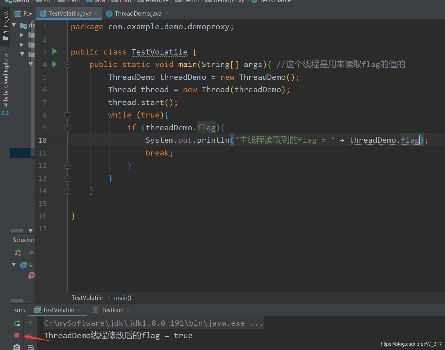 上图中这段代码很简单,就是一个ThreadDemo类继承Runnable创建一个线程。它有一个成员变量flag为false,然后重写run方法,在run方法里面将flag改为true,同时还有一条输出语句。然后就是main方法主线程去读取flag。如果flag为true,就会break掉while循环,否则就是死循环。按道理,下面那个线程将flag改为true了,主线程读取到的应该也是true,循环应该会结束。运行结果
