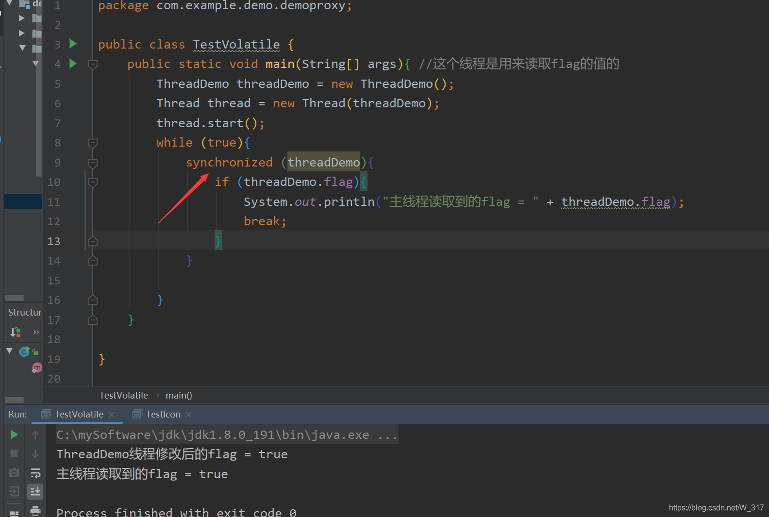 volatile关键字:当多个线程操作共享数据时,可以保证内存中的数据可见。用这个关键字修饰共享数据,就会及时的把线程缓存中的数据刷新到主存中去,也可以理解为,就是直接操作主存中的数据。所以在不使用锁的情况下,可以使用volatile。如下: