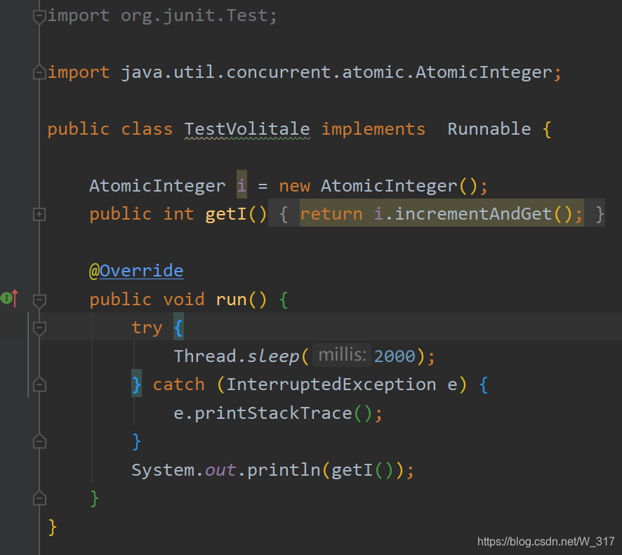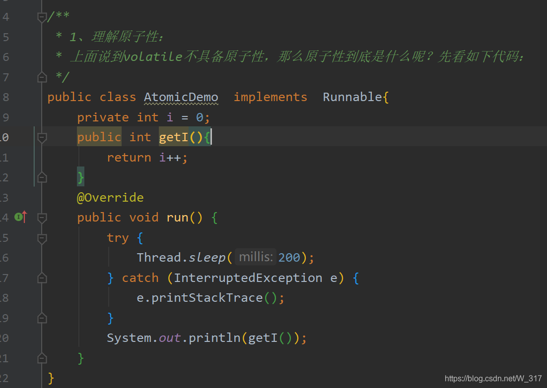 上面说到volatile不具备原子性,那么原子性到底是什么呢?先看如下代码:
