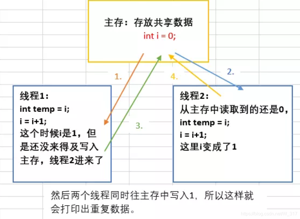 看到这里,好像和上面的内存可见性问题一样。是不是加个volatile关键字就可以了呢?其实不是的,因为加了volatile,只是相当于所有线程都是在主存中操作数据而已,但是不具备互斥性。比如两个线程同时读取主存中的0,然后又同时自增,同时写入主存,结果还是会出现重复数据。