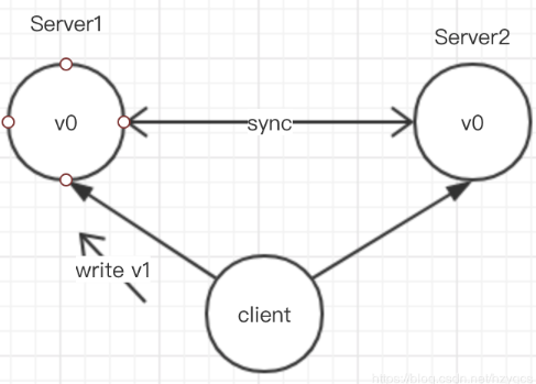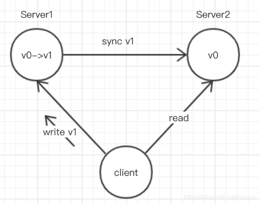 假设某一时间client向server1服务器更新vo->v1,之后不管从server1还是从server2取值都是v1,这样才满足一致性。而如果cleint往server1写过数据后,从server2中去获取值,此时server1和server2之间还未同步,那么就会依然获取到vo,那么就不满足一致性。