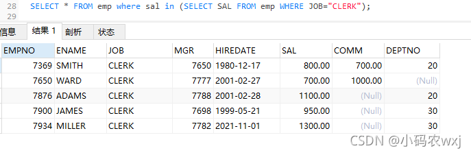SELECT * FROM emp where sal in (SELECT SAL FROM emp WHERE JOB="CLERK");
