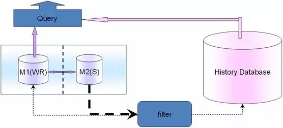 实现途径是通过 slave库查询出所有的数据,然后根据业务规则比如时间、某一个纬度等过滤筛选出数据,放入历史数据库(History Databases)里面。迁移完了,再回到主库M1上,删除掉这些历史数据。这样在业务层面,查询就要兼顾现在实时数据和历史数据,可以在filter 上面根据迁移规则把online查询和history查询对接起来。比如说一个月之内的在online库查询一个月之前的在history库查询,可以把这个规则放在DB的迁移filter层和应用查询业务模块层。如果可以的话,还可以配置更细化,通过应用查询业务模块层来影响DB的迁移filter层,比如以前查询分为一个月为基准,现在查询业务变化了,以15天为基准,那么应用查询业务模块层变化会自动让DB的filter层也变化,实现半个自动化,更加智能一些。