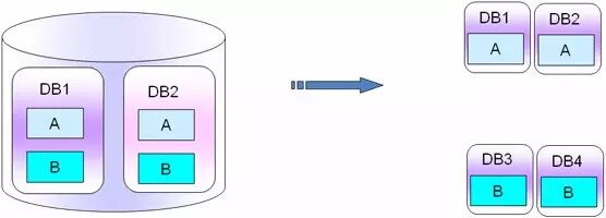 PS:这种拆分主要针对于不同的业务对表的影响不大,表之间的业务关联很弱或者基本上没有业务关联。拆分的好处是不相关的数据表拆分到不同的实例里面,对数据库的容量扩展和性能提高的均衡来说,都是蛮有好处的。