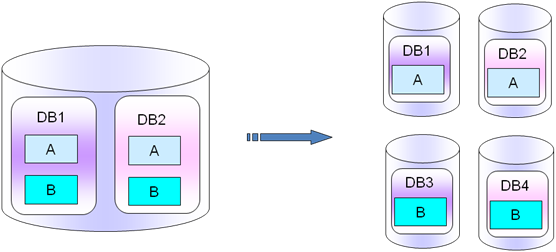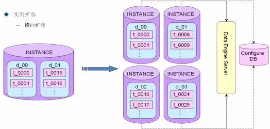 纵向扩容:一个实例拆分成多个实例,纵向拆分比较简单,修改的东西比较少,拆分的时候要通知到Configure DB或者DES,以免拆分之后查询不到数据或者数据录入不到新的db上面,如下图所示: