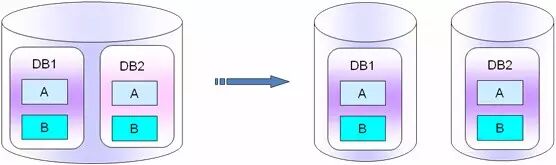 这种库纵向拆分里面,单独的库db1,表A和表B是强关联的。如下图所示: