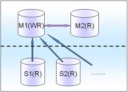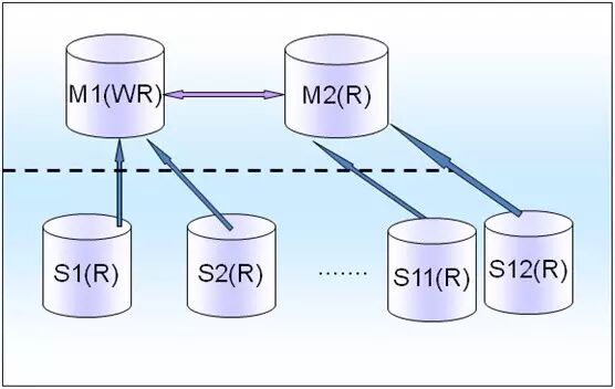 M(R)仅仅是一个备库,只有M(WR)挂了之后,才会切换到M(R)上,这个时候M(R)就变成了读写库。比如游戏系统,有很多Salve会挂载后面一个M(R)上面。