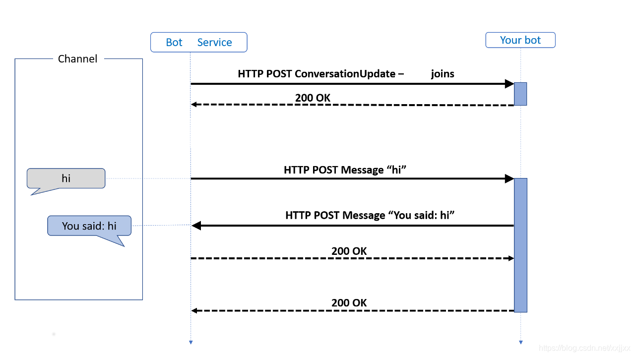 我们来看一个简单例子:用户在模拟器里对bot发送一个”hi”消息,然后bot回复一个”You said: hi”消息。整个流程如下: