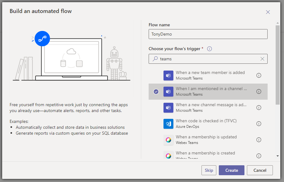 下面列出了所有可以使用的触发器,一个Flow的运行是靠触发器来触发的,可以看到目前已经有了三个关于Teams的触发器,我们选择 “When I am mentioned in a channel”,意思就是当有人在Teams里的频道中 @ 了我,这个Flow就会被触发。点击 Create 按钮