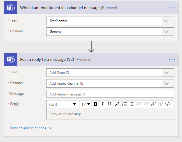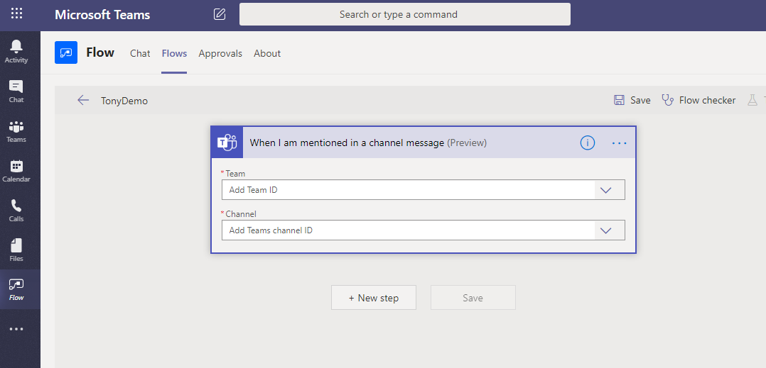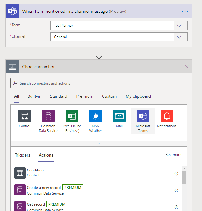 下图是一个标准的Flow编辑器,我们选一个Team,然后再选择一个Channel,就是说如果在这个channel频道里如果有人 @ 我,那这个flow就开始执行。