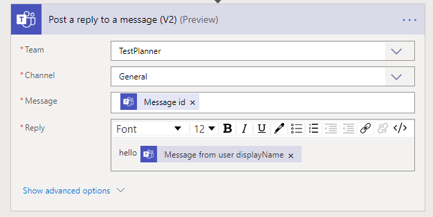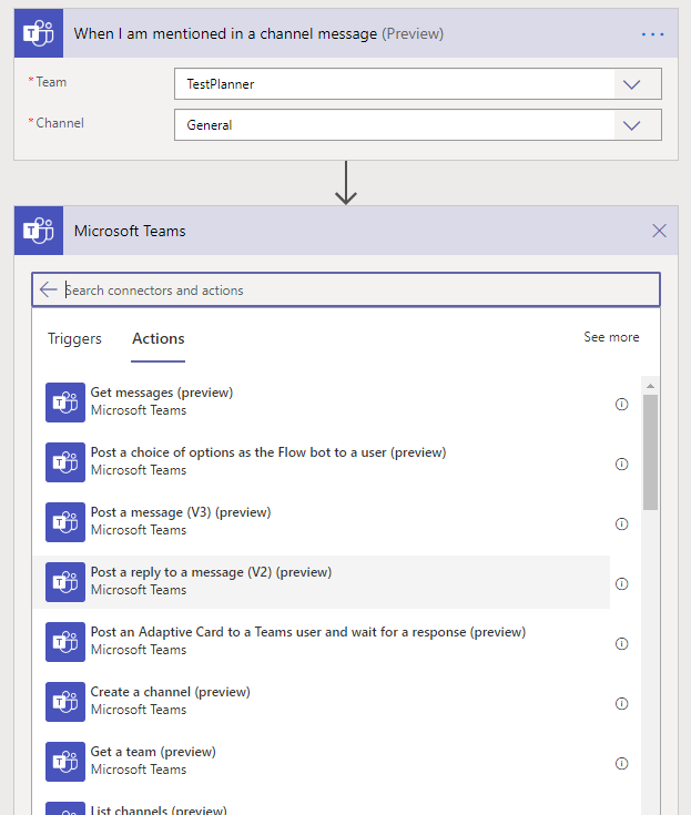选择后就列出了teams相关的所有action,大家可以仔细看一遍,有很多有用的action,我这里为了简单起见,就选择了 Post a reply to a message (V2) (preview),就是回复 @ 我的用户一条消息。