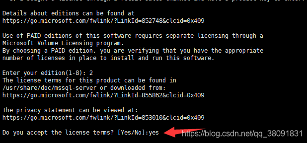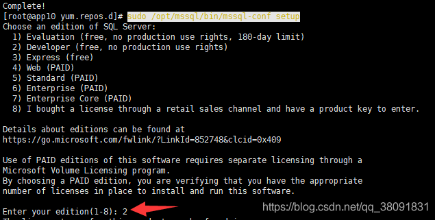 3、软件包安装完成后,运行mssql conf 安装命令并按照操作提示设置 SA 密码,并选择你的版本。