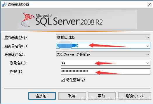 通过windows下的SQL Manager Studio 管理工具连接到Linux 上的SQL Server,此处密码为你安装过程中设置的密码