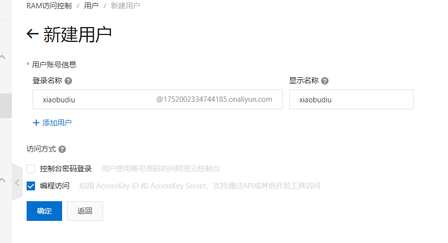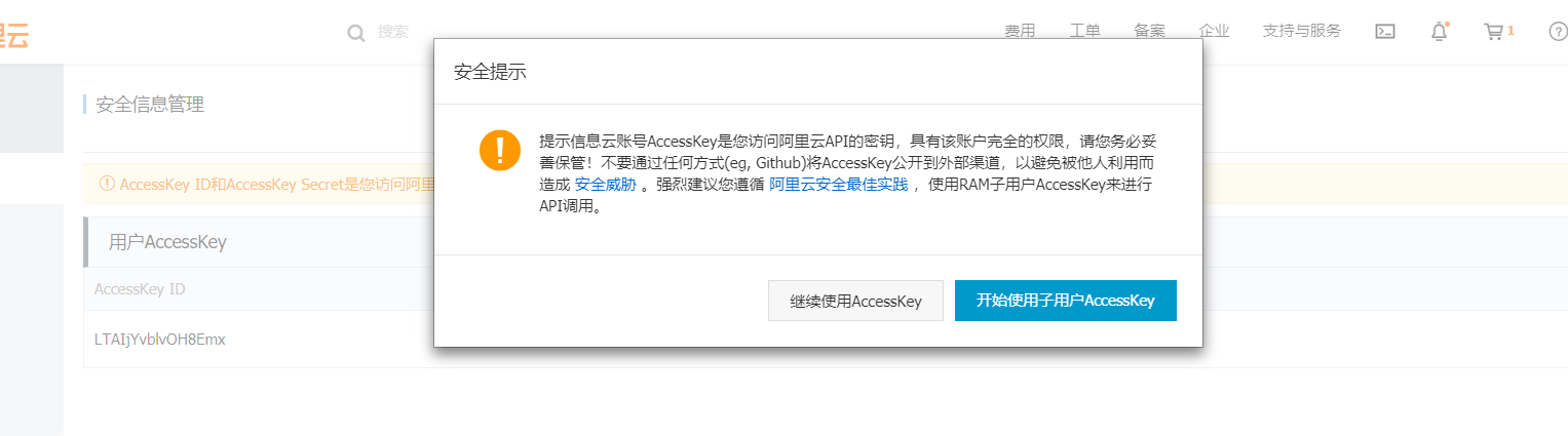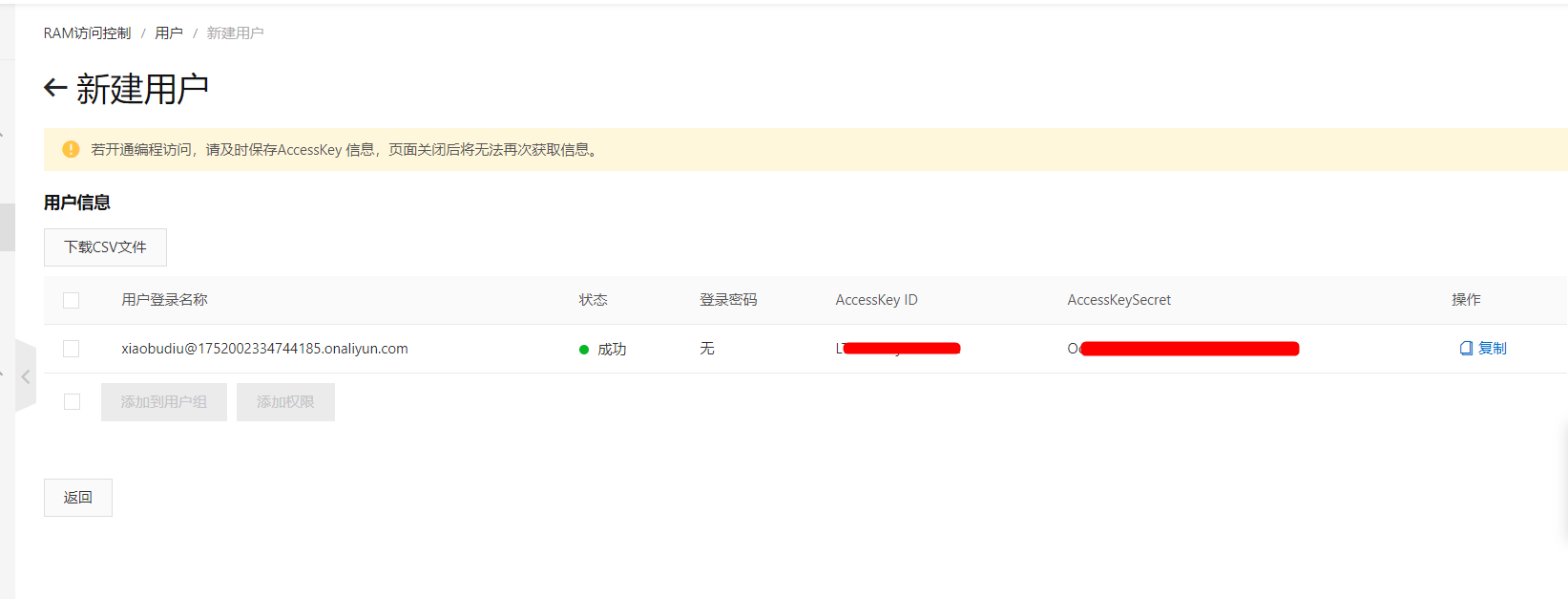 5、创建完毕后,会出现下面的页面,我们可以看到已经有accessKeyId、accessKeySecret了