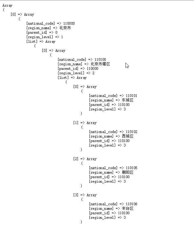 /*** 获取全国省市区列表(格式化后)*/public function getRegionList(){$data = CoreRegion::find()->select(['national_code', 'region_name', 'parent_id', 'region_level'])->asArray()->all();$data = $this->assembleRegionData($data);return $data;}/*** 重组地区数据*/public function assembleRegionData($data, $pid = 0){$list = [];foreach ($data as $k => $v) {if ($v['parent_id'] == $pid) {// 继续查找其子市区县$v['list'] = $this->assembleRegionData($data, $v['national_code']);// 如果子地区为空,则unset掉if (empty($v['list'])) {unset($v['list']);}$list[] = $v;}}return $list;}